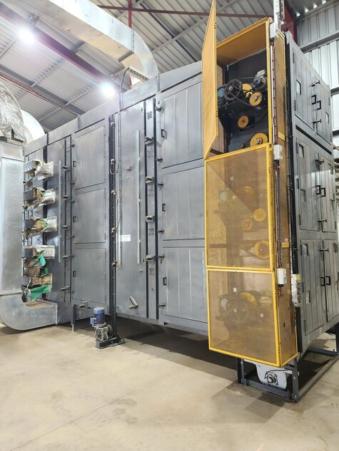 The 3 year old Steamtech Engineers dryer is a 5 belt dryer, with stainless steel belts, has 4 spike rollers per belt available, upgraded internal belt shields, fan motor and mounting for hot air burner and the associated ducting for the heat transfer. Current capacity in its current location and with the crops its drying is reportedly around the 200KG/hour.